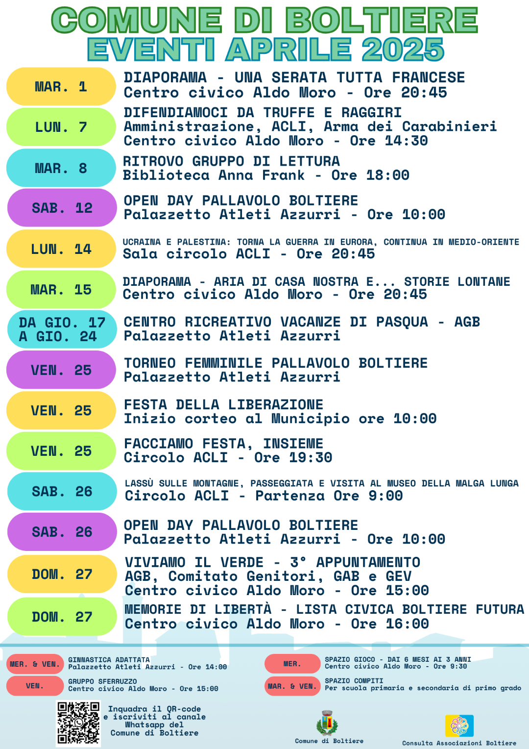 Il mese di aprile si preannuncia denso di appuntamenti per il Comune di Boltiere, con numerose iniziative promosse dall’amministrazione comunale e dalle associazioni locali, coordinate dalla Consulta delle Associazioni.