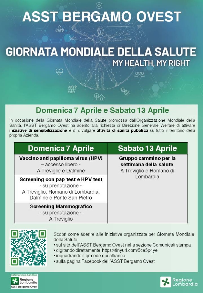 In occasione della Giornata Mondiale della Salute promossa dall'Organizzazione Mondiale della Sanità, l’ASST Bergamo Ovest ha aderito alla richiesta di Direzione Generale Welfare di attivare iniziative di sensibilizzazione e di divulgare attività di sanità pubblica su tutto il territorio della propria Azienda.