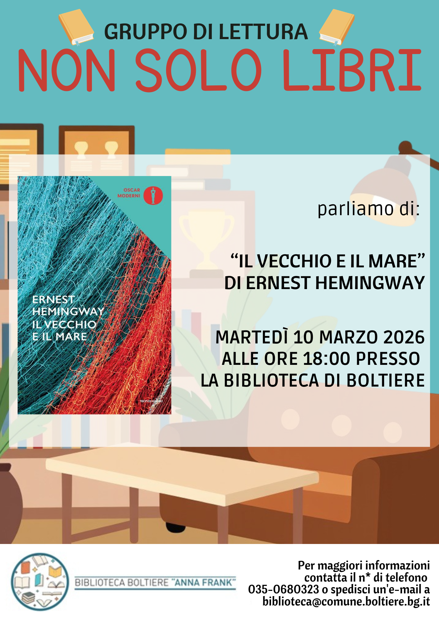 Il Gruppo di Lettura "Non solo libri" invita tutti gli interessati all'incontro di martedì 10 marzo 2026 presso la Biblioteca Civica alle h. 18:00.