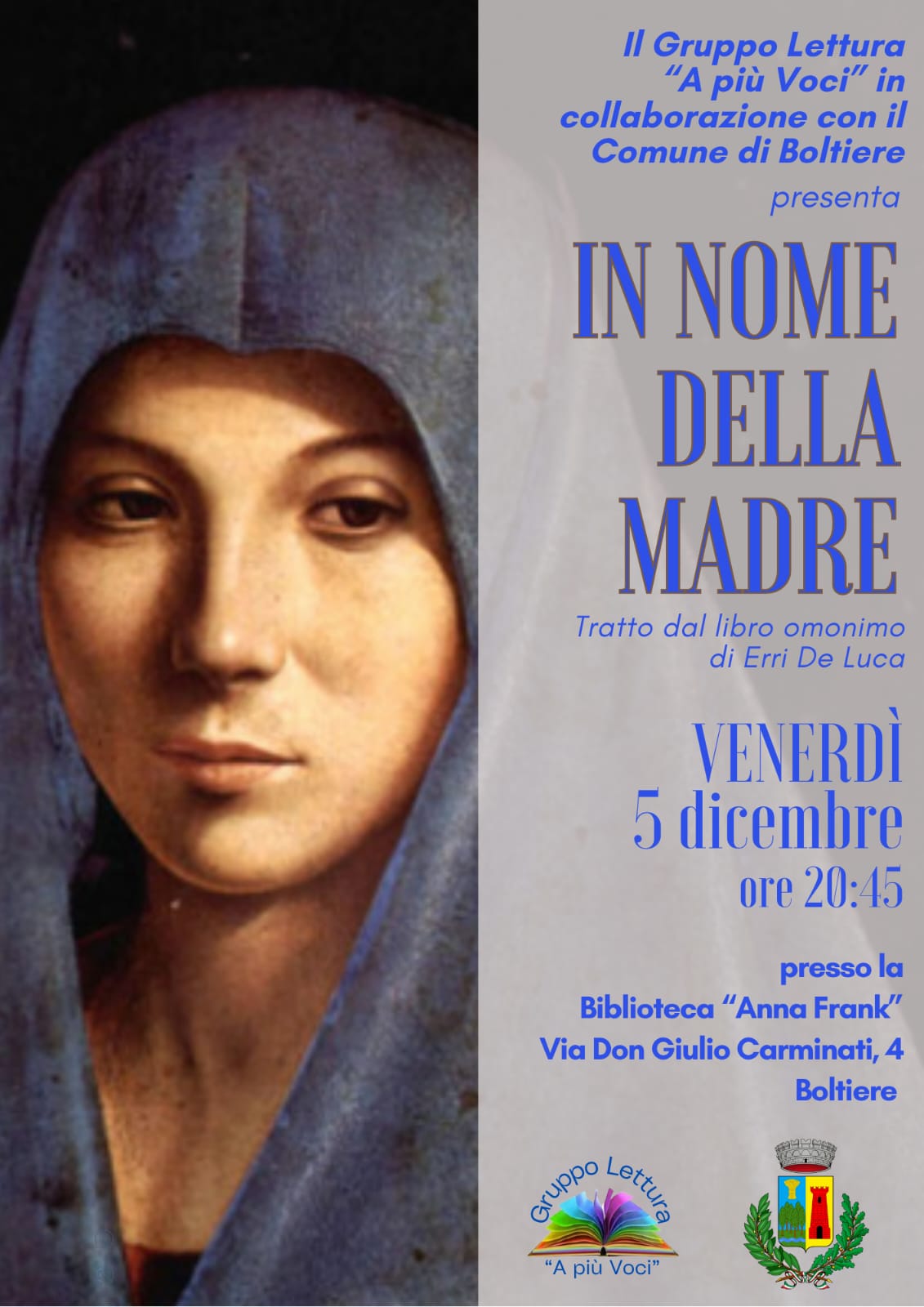 Il Gruppo Lettura "A più Voci" in collaborazione con il Comune di Boltiere, presenta l'incontro "In nome della madre" presso la Biblioteca Anna Frank di Boltiere.