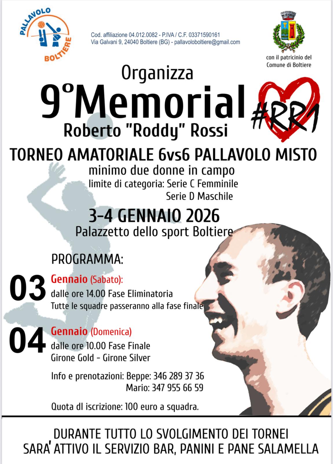 Descrizione L'ASD Polizportiva Boltiere - Sezione Pallavolo organizza il nono appuntamento con il "Memorial Torneo Roberto "Roddy" Rossi" presso il Palazzetto Atleti Azzurri d'Italia.